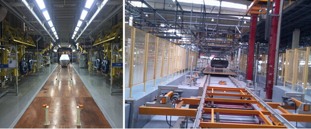 滑板式輸送機由滑板、摩擦驅動組成。主驅動利用摩擦驅動輪驅動滑板兩側,該滑板靠此推力又將前面的滑板向前推送,這樣就形成連續輸送。滑板輸送機同時移動車身和進行裝配的操作工人,使工人在裝配工序的操作更加容易。