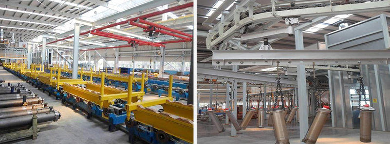 綜合油缸涂裝生產線采用XT160懸掛輸送機輸送工件,輸送速度在0.5-3m/min內可調,工作速度1.6m/min;變幅油缸涂裝生產線采用積放式懸掛輸送機,工件上下件出設有液壓升降臺配合工件上下輸送設備;伸縮油缸涂裝生產線采用地面小車輸送工件,地面小車采用四套垂直地面鏈輸送裝置輸送工件。